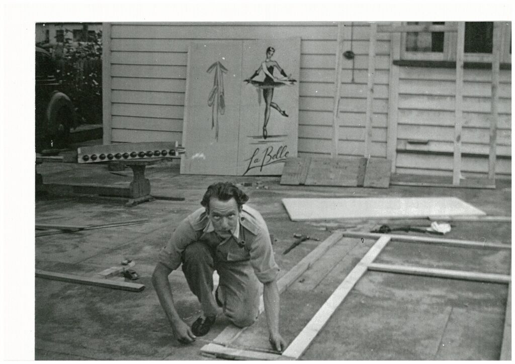 Many early tours by the New Zealand Ballet were undertaken under the auspices of the Community Arts Service, a national network dedicated to promoting the arts in rural areas. With links to the University of New Zealand and a commitment to adult education, CAS was a vital support to many touring artists during the 1950s and through their local volunteers including billeting, helped to make dance, drama and music a viable career. Poul Gnatt is pictured at the wheel of a CAS truck in the early 1950s, essential for transporting costumes and scenery.