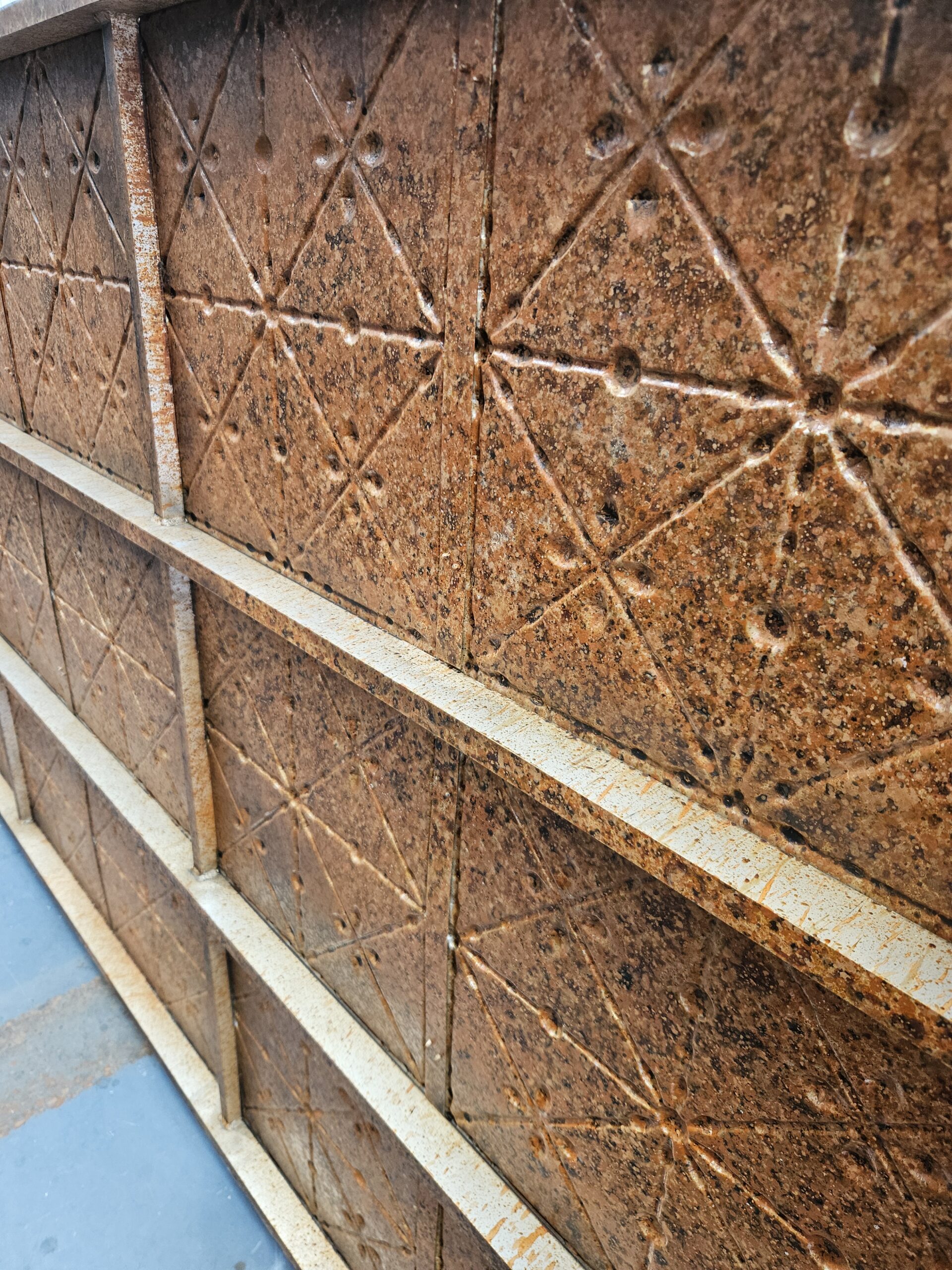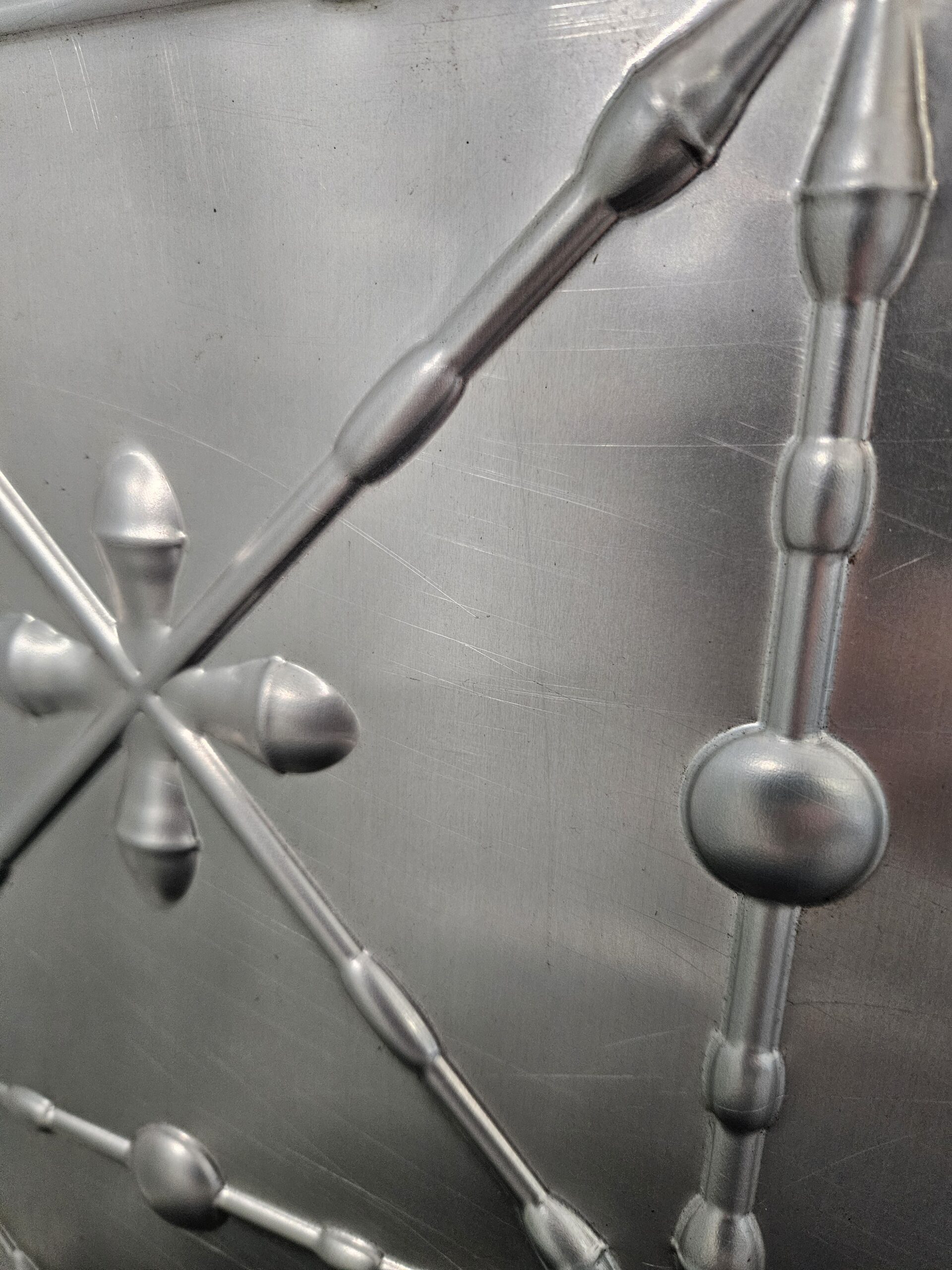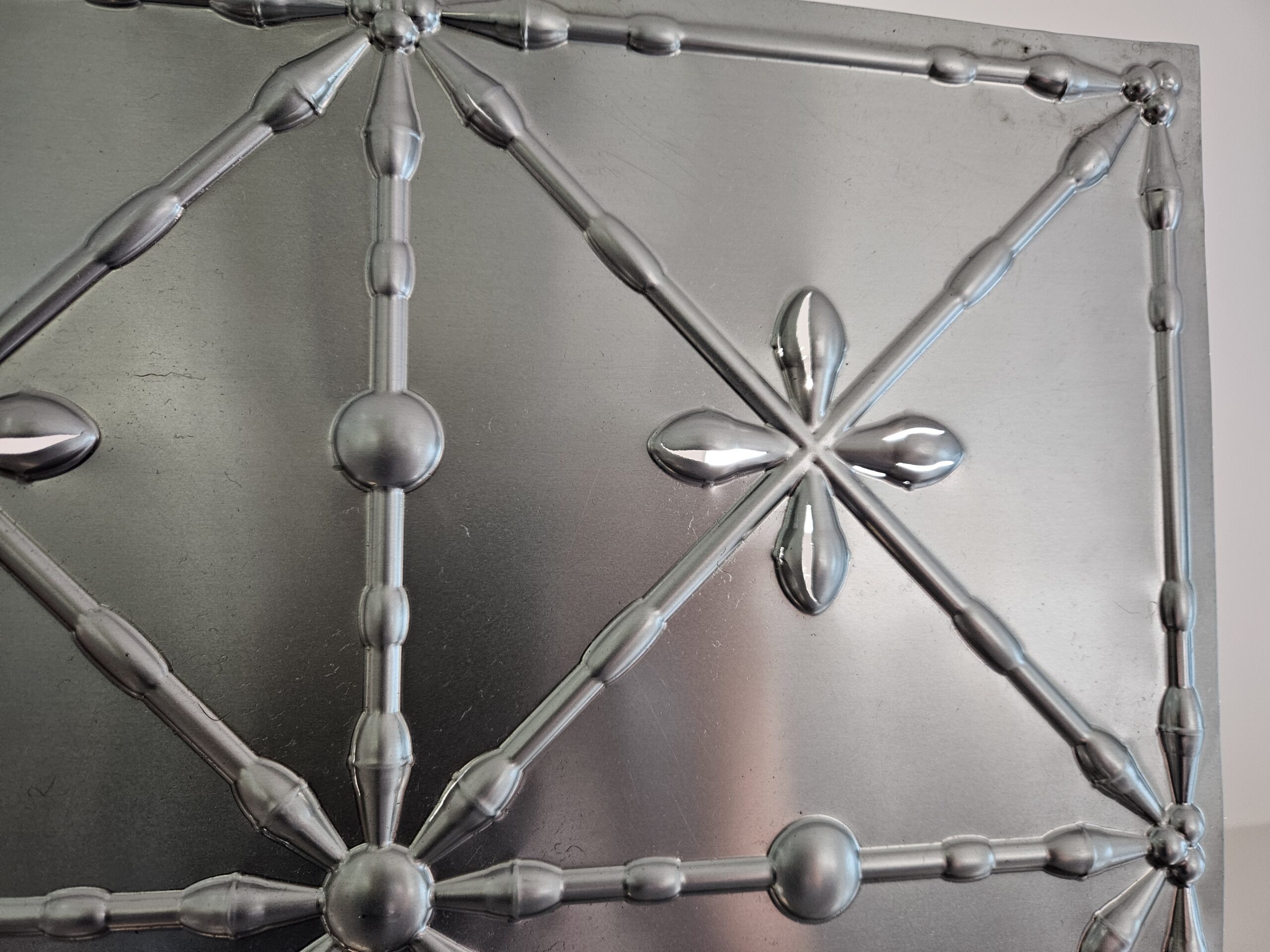 In around April 2025, Drew (Andrew Lees, Technical Director at the RNZB) and I started talking about the panels for Macbeth. The overall design from Jon Buswell had the look and feel of pressed tin panels, but at a much larger scale and with a much bolder repeat pattern. The idea was to complete these in thin aluminium – it made sense given its malleability, weight advantage, and workability.