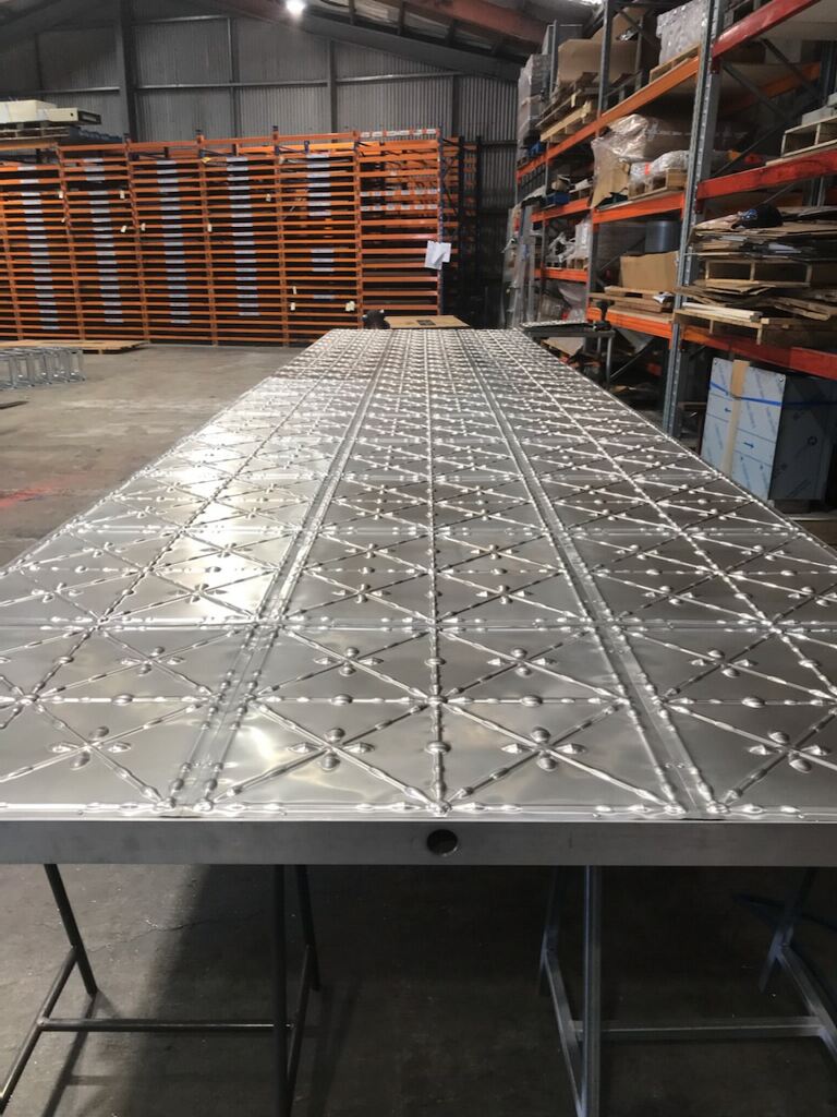 We started with 3D printed test stamps to test the methodology of pressing the tiles in our press brake. That gave us our proof of concept. The idea was to create a positive and negative mould that would manipulate the aluminium into the given shape and contours. Once that checked out, we got the final moulds made via CNC machining and created a specific tool to house the upper section and hold it in place, so the press could cycle and produce the regular consistency we needed.